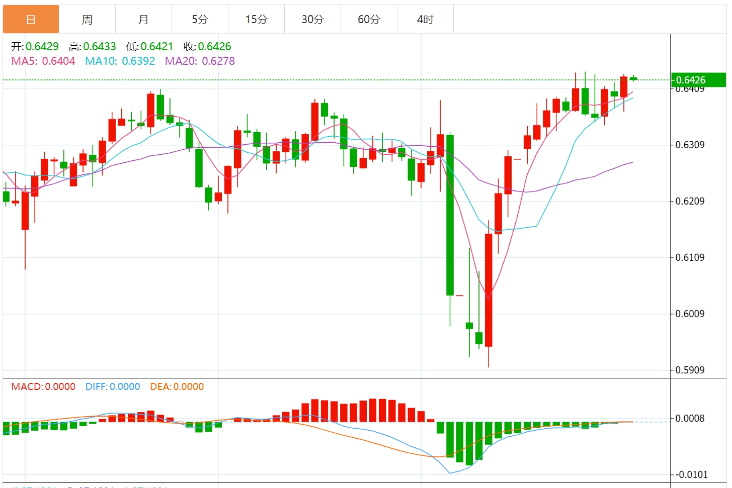 技术上,澳元/美元价格波动范围在0.6368和0.6430之间。 相对强弱指数(RSI)中性,读数为59.55,而移动平均收敛/发散(MACD)发出买入信号。 终极振振盪器和随机指标%K均为中性,表明市场动能存在犹豫。