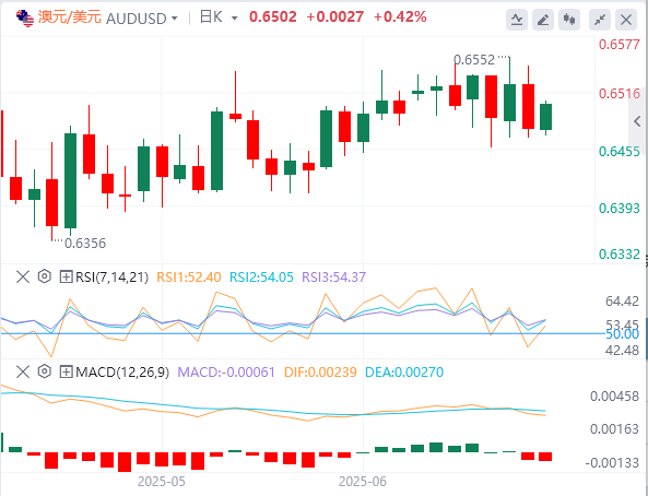 澳元/美元周三交投于0.6480附近,普遍看涨,因为日线图的技术分析表明该货币对仍处于上升通道内。此外,14天相对强弱指数(RSI)略高于50关口,表明普遍看涨前景。然而,该货币对已跌破9天指数移动平均线(EMA),表明短期价格势头正在减弱。