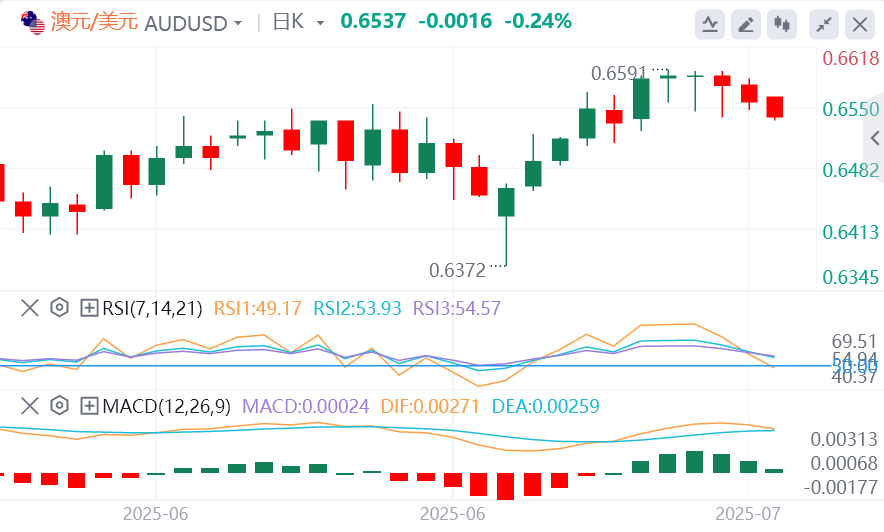 交易员将关注周二的澳大利亚储备银行(RBA)货币政策会议。路透社的最新民意调查显示,37位经济学家中有31位预计澳洲联储将在7月份降息25个基点。现在的预测中值预计,到2025年底,现金利率将从5月份调查的3.35%降至3.10%。