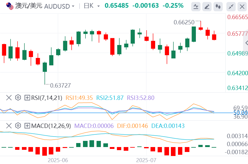 周一澳元/美元交投于0.6570附近。日线图的技术分析表明,由于该货币对仍处于上升通道形态内,因此普遍存在看涨倾向。14天相对强弱指数(RSI)位于50关口上方,强化了看涨倾向。此外,该货币对仍高于九天指数移动平均线(EMA),表明短期价格势头更强劲。