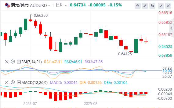 下行方面,澳元/美元货币对可能会在0.6477的9日均线处找到直接支撑。跌破该水平将削弱短期价格动能,并给该货币对带来下行压力,目标是8月21日创下的两个月低点0.6414。进一步下跌将在6月23日触及的三个月低点0.6372附近找到支撑,与下降通道的下边界一致。