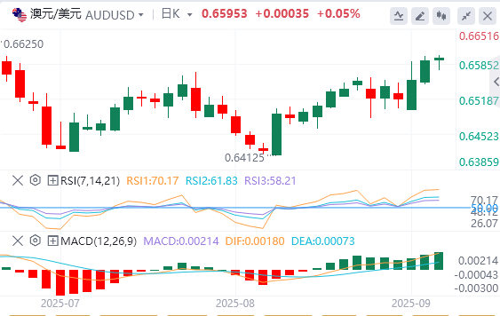 阻力位首先出现在9月高点0.6598(9月8日),然后是2025年上限0.6625(7月24日)。突破后者可能会打开通往2024年11月高点0.6687(11月7日)的大门,然后是心理关口0.7000。