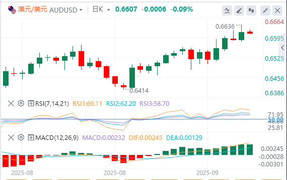 主要阻力位在9月10日创下的10个月高点0.6635,其次是上升通道的上限0.6650附近。突破这一关键阻力区将加强看涨倾向,并支持澳元/美元向2024年11月创下的11个月高点0.6687移动。