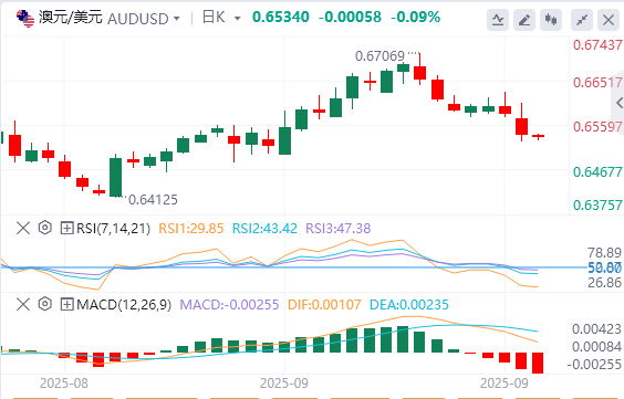 澳元/美元周五交投于0.6530附近。日线图上的技术分析显示,该货币对位于九日指数移动平均线(EMA)下方,表明短期价格动能较弱。此外,14天相对强弱指数(RSI)跌破50水平,表明看跌偏见活跃。