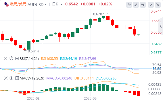 周五澳元/美元交投于0.6530附近。日线图上的技术分析显示,该货币对位于九日指数移动平均线(EMA)下方,表明短期价格势头较弱。此外,14天相对强弱指数(RSI)跌破50水平,表明看跌偏见活跃。
