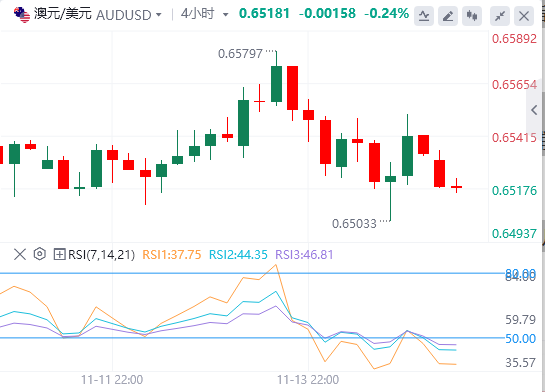 在强劲的国内就业数据强化了对澳大利亚储备银行(RBA)谨慎立场的预期后,澳元获得支撑。截至11月14日最新更新,澳大利亚证券交易所2025年12月30天银行间现金利率期货交易价格为96.41,反映出在即将举行的澳大利亚央行董事会会议上从3.60%降至3.35%的可能性为6%。