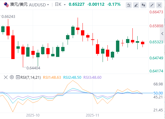 在强劲的国内就业数据强化了对澳大利亚储备银行(RBA)谨慎立场的预期后,澳元获得支撑。截至11月14日最新更新,澳大利亚证券交易所2025年12月30天银行间现金利率期货交易价格为96.41,反映出在即将举行的澳大利亚央行董事会会议上从3.60%降至3.35%的可能性为6%。