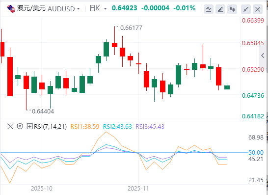 然而,随着国内就业数据强劲,澳元可能会重新获得支撑,这强化了澳大利亚储备银行(RBA)对谨慎立场的预期。截至11月14日的最新更新,2025年12月澳交所30天银行间现金利率期货报96.41,显示即将召开的澳储银行董事会会议上,利率从3.60%降至3.35%的概率为6%。