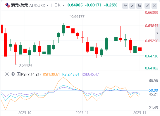 随着澳大利亚储备银行(RBA)对谨慎立场的预期加剧,澳元可能重新获得支撑,这一趋势受国内就业数据强劲推动。截至11月18日最新更新,2025年12月澳交所30天银行间现金利率期货报96.41,显示即将召开的澳储银行董事会会议上,利率从3.60%降至3.35%的概率为8%。