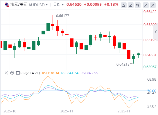 然而,澳元兑美元货币对获得了支撑,因为澳储市场对澳储会谨慎立场的预期逐渐增强。澳储银行11月会议纪要显示,央行可能会在较长时间内维持利率不变。ASX30日银行间现金利率期货显示,截至11月20日,2025年12月合约报96.41,这意味着在即将召开的澳储银行董事会会议上,降息概率从3.60%降至3.35%。
