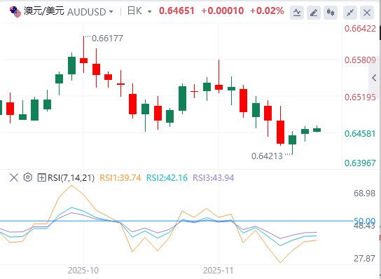 相反,100日和55日均线分别在0.6533和0.6548出现临时关口,随后11月顶点0.6580(11月13日)和10月峰值0.6629(10月1日)。额外涨幅可能再次触及2025年0.6707(9月17日)的天花板,随后是2024年0.6942(9月30日)和0.7000的顶点。