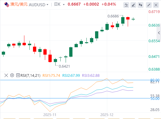 澳元/美元在周五欧洲早盘稳健地在0.6660附近交易。该货币对守在上升的20指数移动平均线(EMA)上方,现为0.6588,支持看涨倾向。20日均线已连续数个交易日上升,持续引导趋势上行。