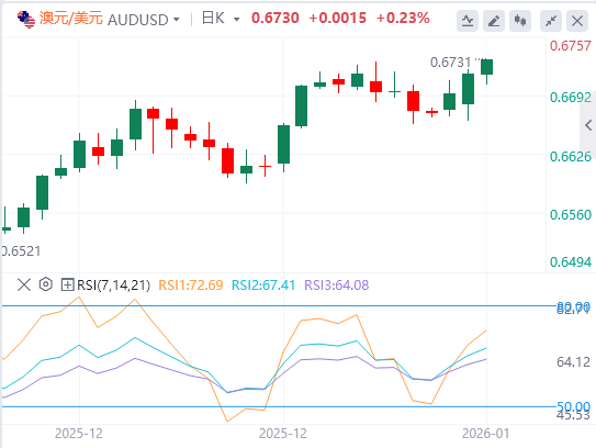 澳元/美元周二交易约为0.6720。日线图的技术分析显示,该货币对从上升通道形态的下限反弹,显示多头偏向增强。14天相对强弱指数(RSI)位于65.64,显示多头动能,且在超买状态下仍有进一步上升空间。