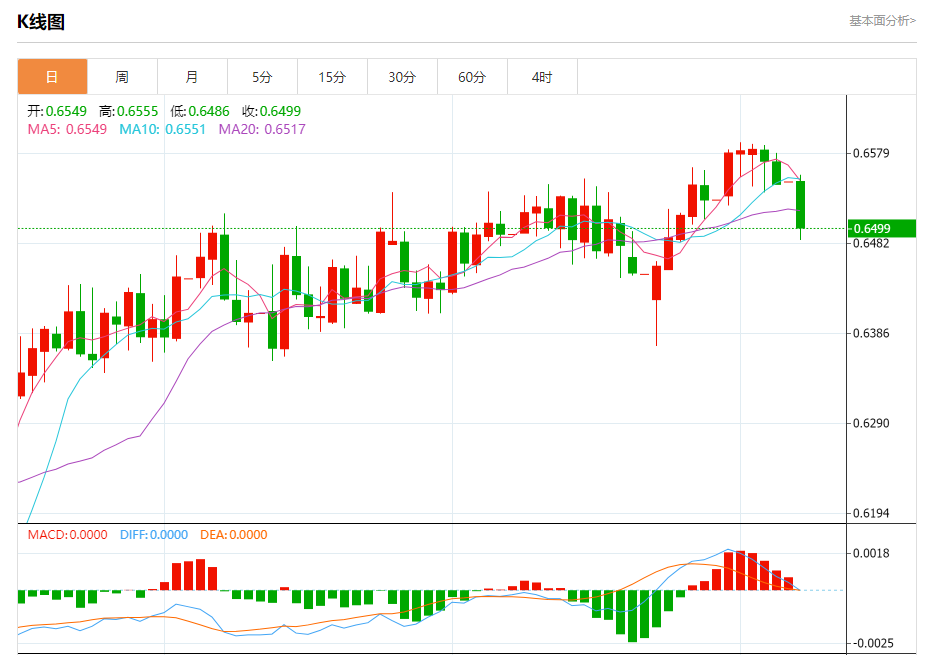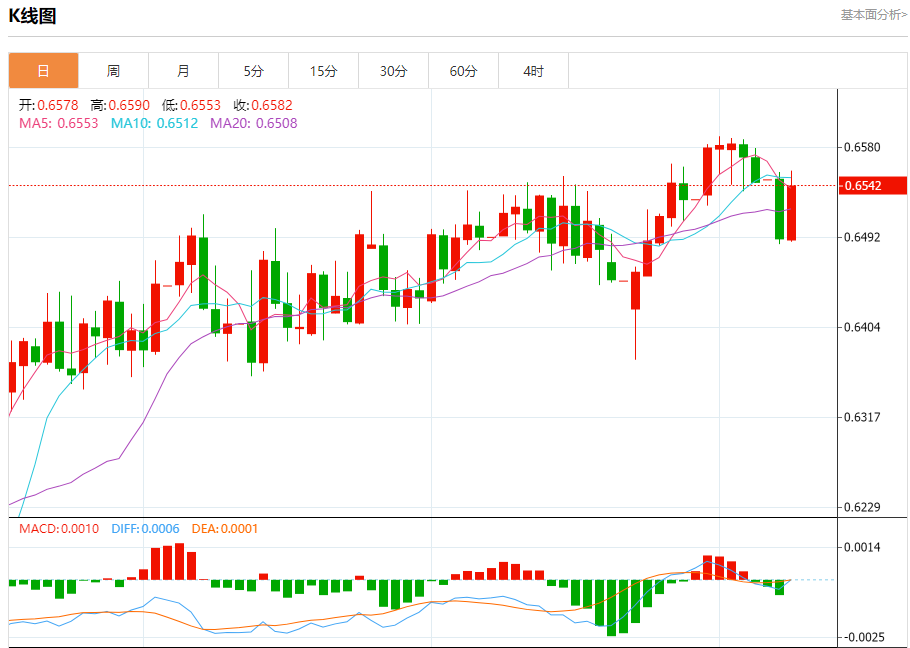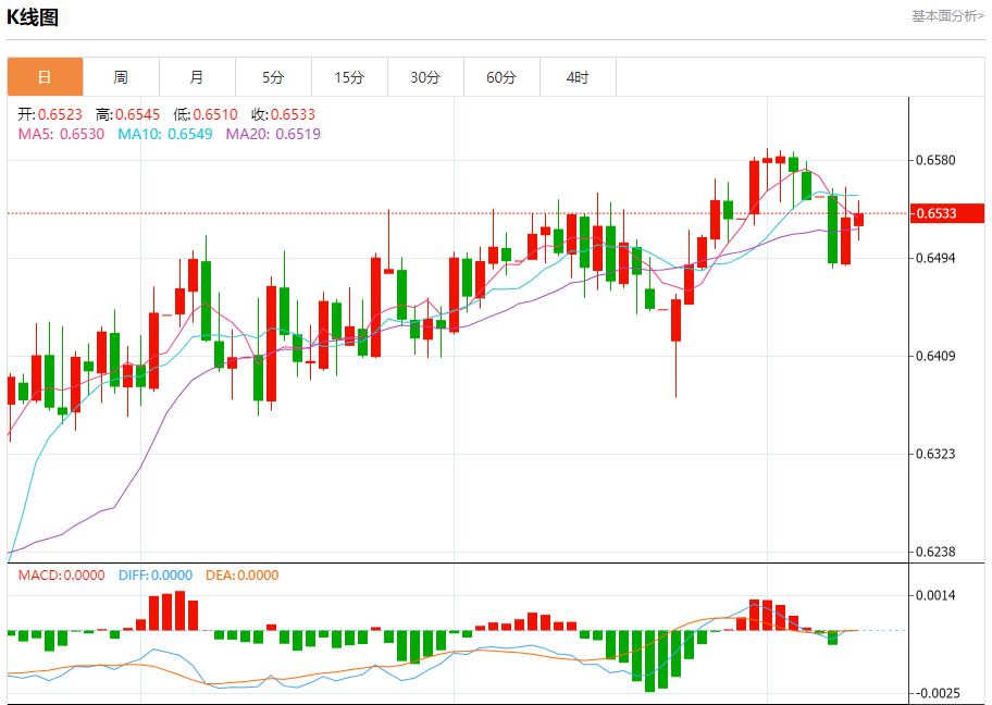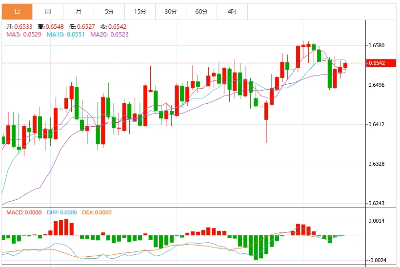澳元兑美元今日汇率最高0.6549,最低0.6547,涨跌0.0014,涨跌幅0.22%。 市场基本面分析 尽管澳洲联储在最新议息会议上意外维持利率不变,但策略师指出,该央行的政策声明中对经济状况的评估基本保持稳定,且货币政策委员会内部投票结果出现分歧,这些信号均表明澳洲联储仅是"调整宽松政策的实施时点,而