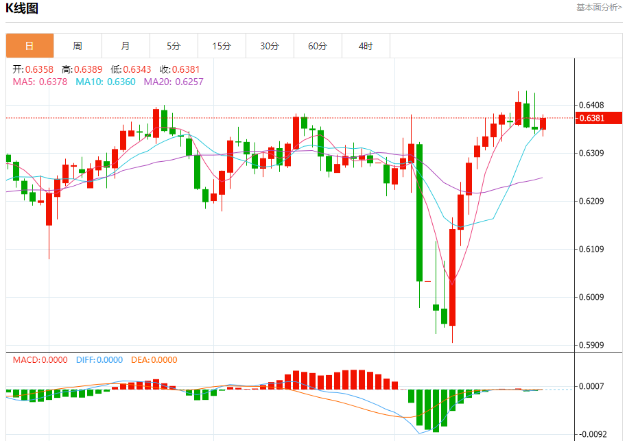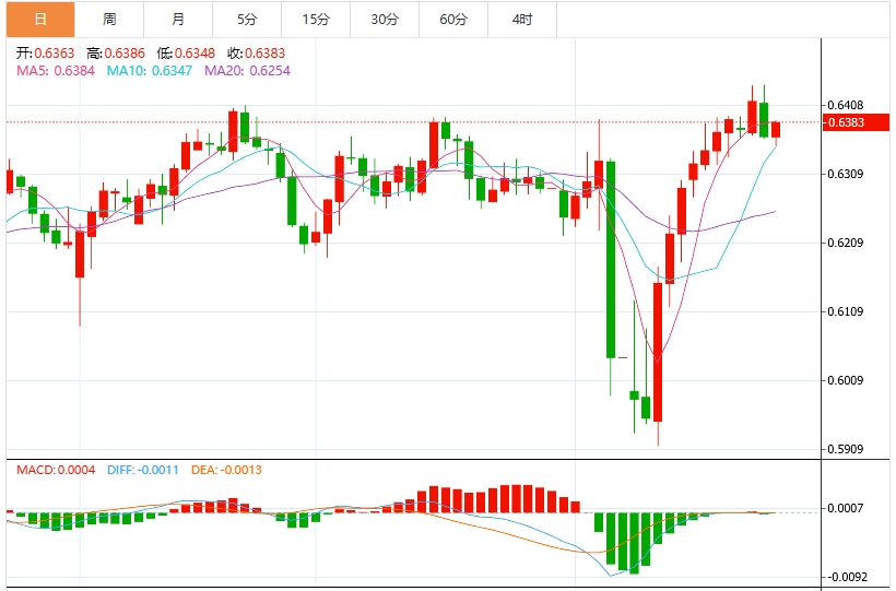 截至发稿时,澳元兑美元汇率报0.6365,较昨日有所下跌,盘中呈现出一定的波动。 货币兑:澳元/美元 一、行情分析 基本面因素 从澳大利亚方面来看,近期澳大利亚的经济数据表现对澳元产生了一定影响。澳大利亚的经济复苏进程仍面临一些挑战,其国内的通胀数据虽有波动,但尚未达到促使澳洲联储(RBA)快