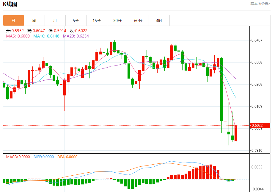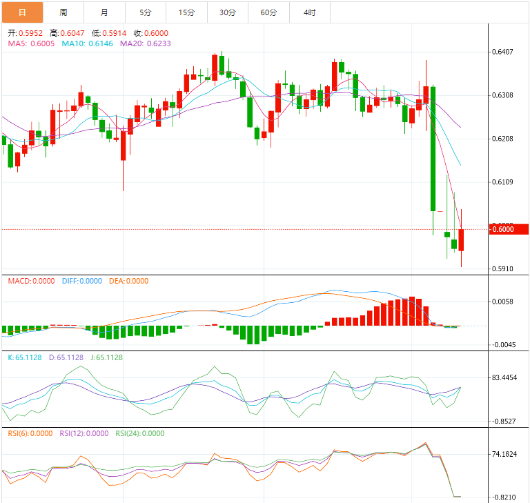 根据外汇市场最新数据,截至上一交易日纽约汇市尾市,澳元兑美元汇率收盘价为0.5955,而在4月9日,该货币对开盘于0.5951。 货币兑:澳元/美元 一、行情分析 截至发稿前,澳元/美元最高上探至0.6003,最低触及0.5913,目前最新交投于0.6001,涨幅达0.7826%。从近期整体趋势来看,澳元兑美元面临着诸多挑