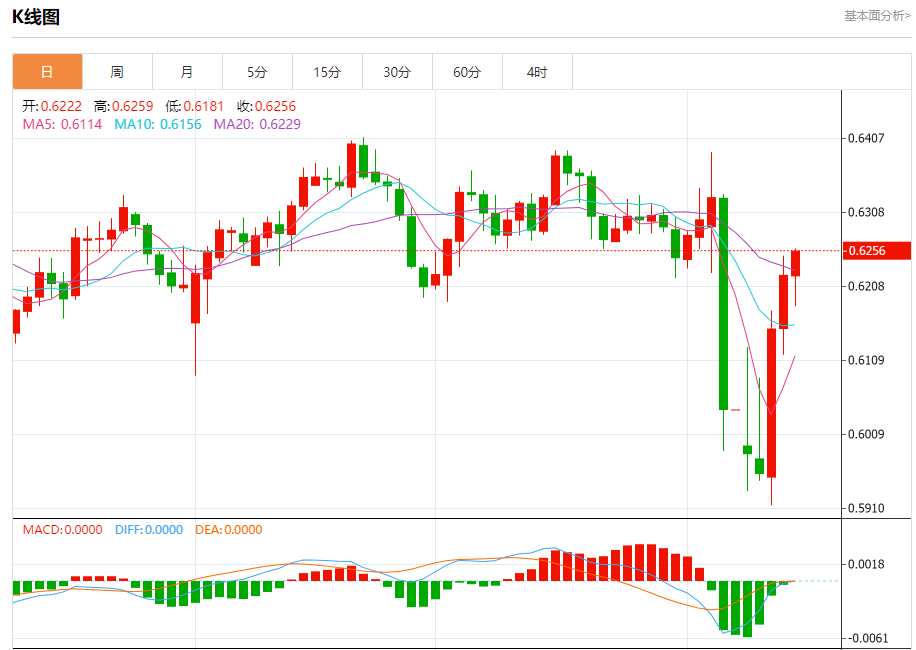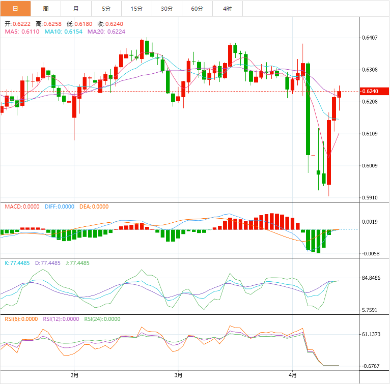 4月11日,澳元兑美元AUD/UD日内涨势迅猛,截至发稿,涨幅超0.50%,现报0.6254,创下五日新高。 货币兑:澳元/美元 行情分析 近期,全球贸易局势的不确定性如阴霾笼罩市场,澳元作为商品货币,其汇率走势与全球经济增长预期及贸易环境紧密相连。此前,美国总统特朗普的关税政策引发市场避险情绪急剧