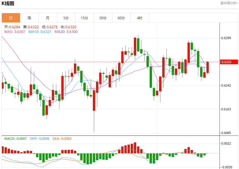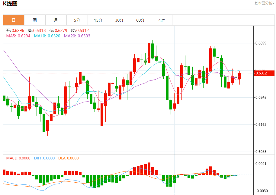 澳元兑美元今日汇率最高0.6312,最低0.6312,涨跌0.0010,涨跌幅0.16%。 市场基本面分析 澳大利亚政府公布了下一财年政府预算案,预算赤字将达421亿澳元。澳国库部长查默斯当晚在联邦议会众议院作预算说明。他说,澳大利亚通胀率比预期提前6个月降至目标区间,民众收入增加,失业率将降至4.25%,利率下降