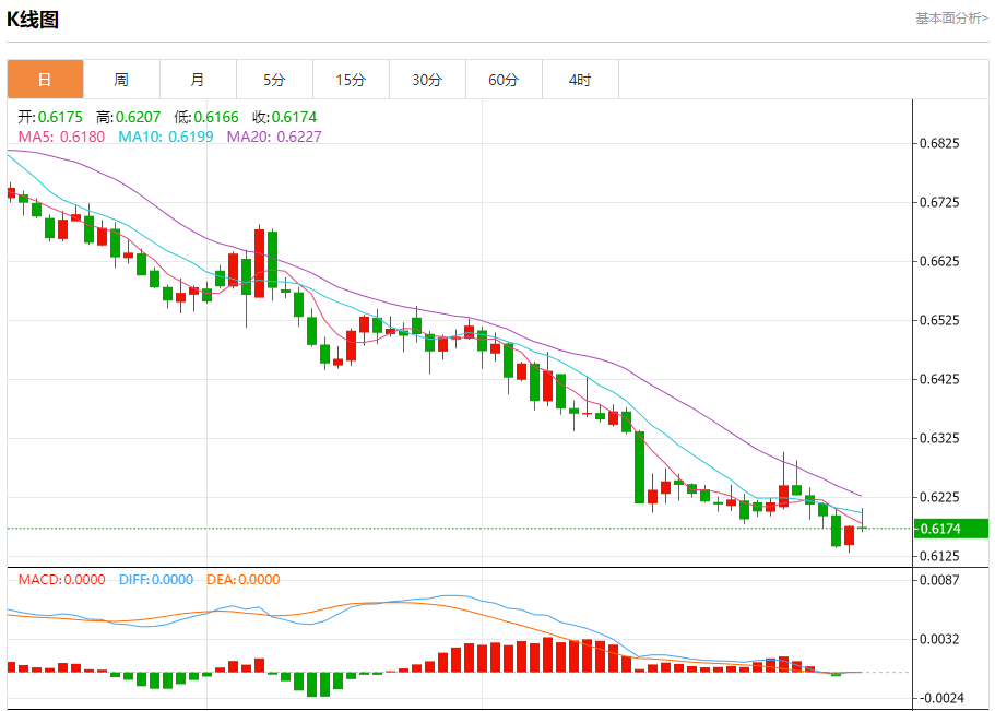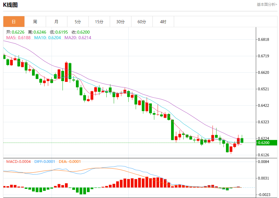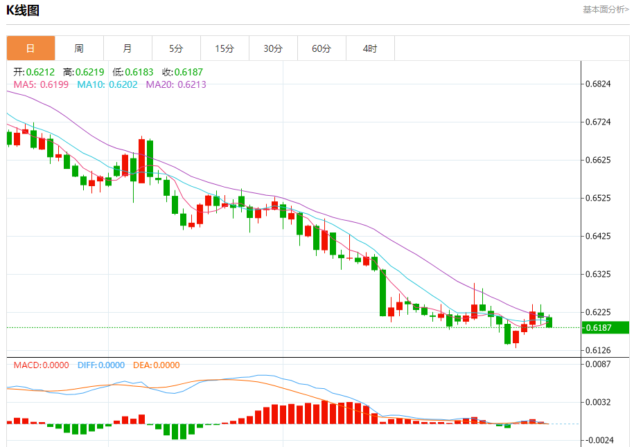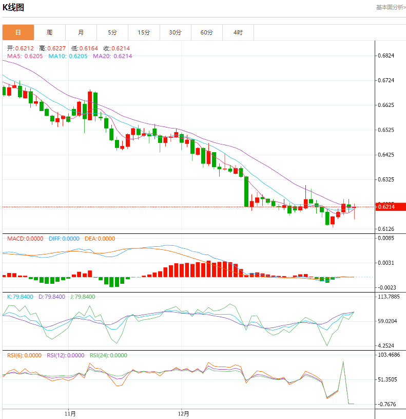 澳元兑美元今日汇率最高0.6199,最低0.6198,涨跌-0.0028,涨跌幅-0.45%。 市场基本面分析 澳元/美元在亚洲盘下跌0.2%,尽管澳洲12月就业数据意外强劲;澳洲12月就业人口增幅超预期,但仍有降息可能;澳大利亚就业市场的弹性意味着,澳洲联储不太可能急于放松政策设置。他补充说,失业率实际上从第三季度