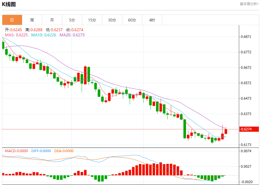 澳元兑美元今日汇率最高0.6269,最低0.6267,涨跌0.0023,涨跌幅0.37%。 市场基本面分析 澳元(AUD)兑美元(UD)周二连续第四个交易日上涨,定于周三公布的澳大利亚11月月度消费者价格指数(CI)将成为焦点。如果该数据低于市场预期,这可能会触发澳大利亚储备银行(RBA)在2月会议上降息的机会,从而打