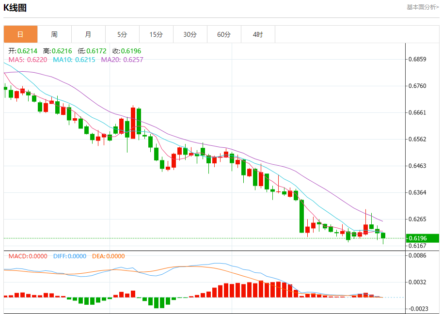 澳元兑美元今日汇率最高0.6196,最低0.6195,涨跌-0.0017,涨跌幅-0.28%。 市场基本面分析 澳元/美元在亚洲时段下跌0.2%,美债收益率在高位盘整,受黑色星期五提振,澳洲零售商顺风顺水,澳洲11月零售销售较前月增加0.8%,路透调查预期为增加1.0%,但并不阻止澳洲联储行降息;利率互换市场暗示2月降息25基