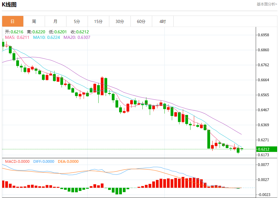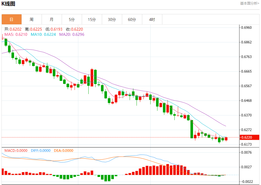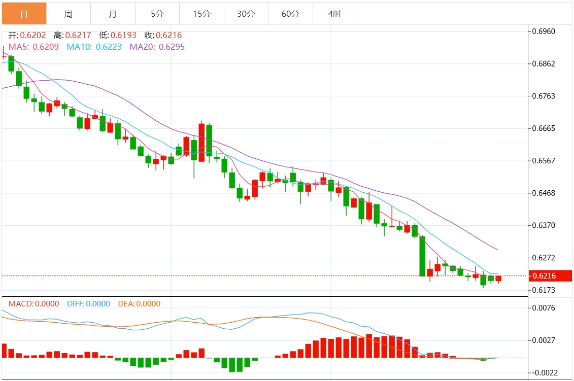 澳元兑美元今日汇率最高0.6216,最低0.6215,涨跌0.0013,涨跌幅0.21%。 市场基本面分析 澳洲联储衡量该国大宗商品出口价格的指标已降至2021年以来的最低点,去年跌幅超过10%。从这方面看,澳元疲软对出口商来说是一大利好,因为它提高了以美元计价的大宗商品的收益。澳元贸易加权汇率处于2020年中期以来