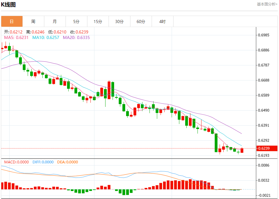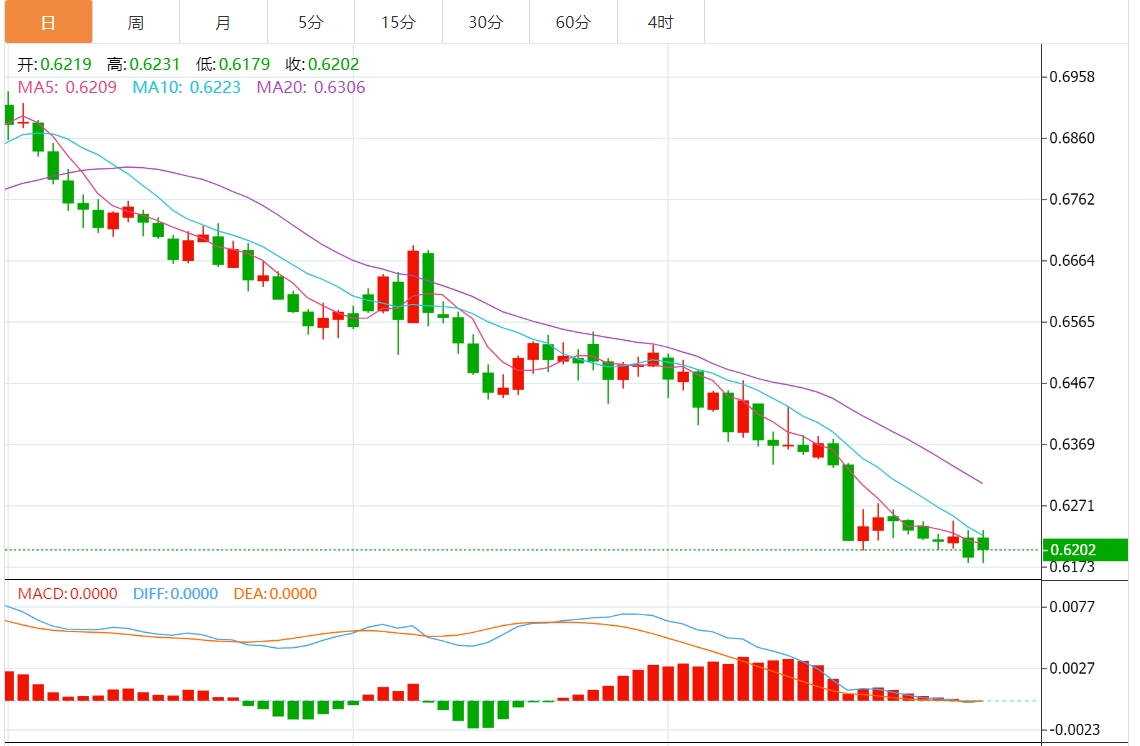 澳元兑美元今日汇率最高0.6246,最低0.6210,涨跌0.0026,涨跌幅0.42%。 市场基本面分析 澳洲联储本月的鸽派转变,促使投资者预估最早在2月降息的可能性约为50%。高盛经济学家AndrwBoak指出,澳洲联储会议记录在本轮周期内首次表明明确的宽松倾向,同时强调消费、工资增长以及住房相关通胀的结果皆弱于预