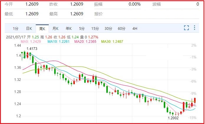 1.美元/加元货币对汇率本周涨幅1.36%,振幅1.52%,最高1.621,最低1.2432,收于1.2616,周线收一中阳线;