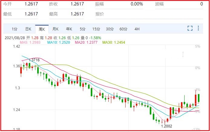 1.美元/加元货币对汇率本周跌幅1.61%,振幅1.99%,最高1.2834,最低1.2579,收于1.2617,周线收一长阴线;