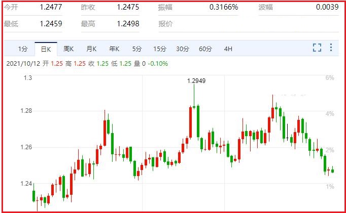 美国固定收益市场周一因假期休市,但指标10年期美债收益率上周五触及四个月高位1.617%,尽管此前数据显示美国9月新增就业岗位数为九个月来最少,远逊于预期。不过,8月数据被大幅上修,且失业率降至18个月最低,这表明对劳动力短缺的担忧仍然是合理的,这让人们继续担心通胀,并让美联储有理由缩减去年开始实施的紧急刺激措施。汇价现报1.2463,跌幅0.22%。