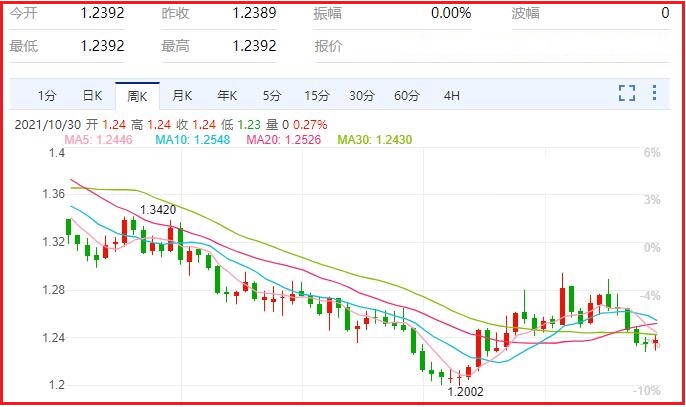 1.美元/加元货币对汇率本周涨幅0.24%,振幅1.05%,最高1.2431,最低1.2301,收于1.2386,周线收一阳星;