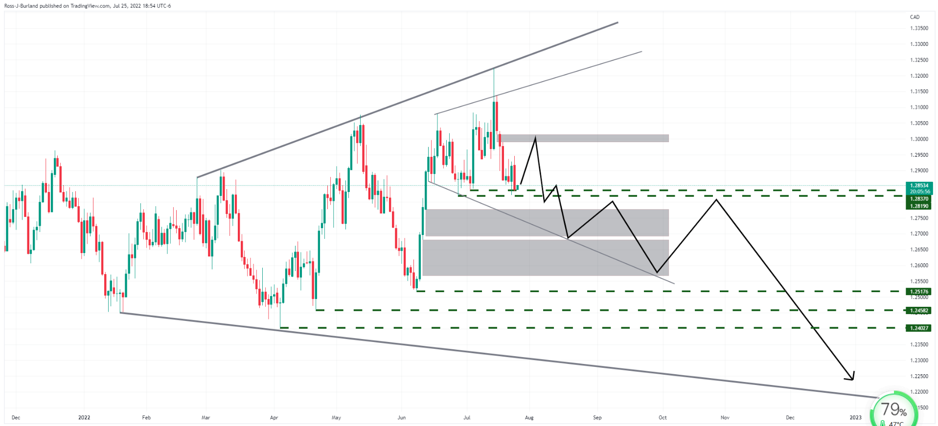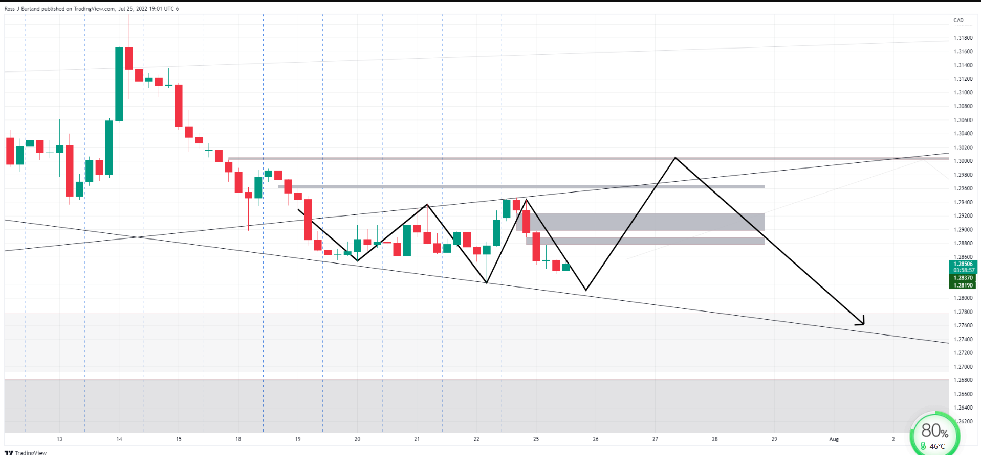 在4个小时的时间框架内,价格也按照拓宽的形成进行交易,价格向上的不平衡可能会在下一次显著下行延续之前吸引多头。与此同时,熊正在靠近,并注意到地层的下端接近1.2800。