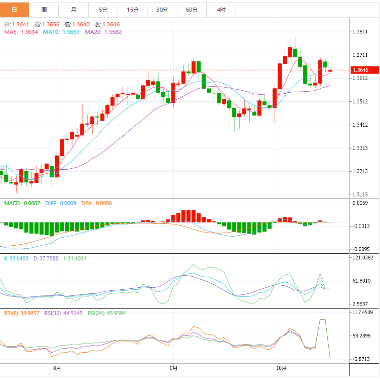 截止目前,美元兑加元下跌至1.3647,跌幅0.09%。