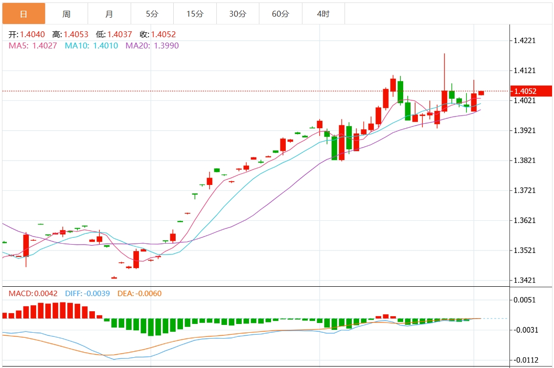 技术上,随着加元(CAD)持续下滑至低位,美元/加元已反转,接近近期高位。加元兑美元获得支撑,处在 1.4000 关口紧上方,中断因加元略走强出现的三日连涨势头。