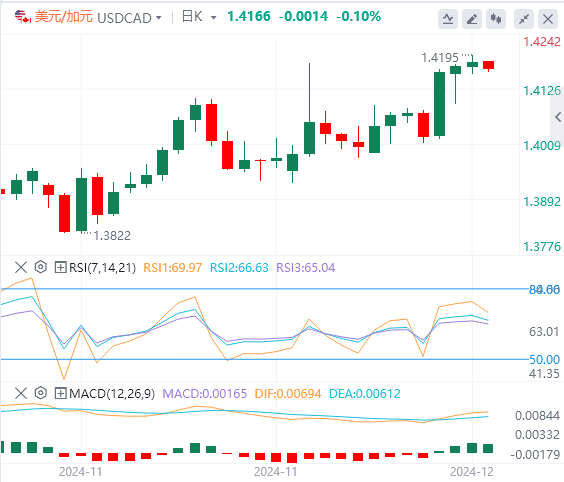 若出现一些后续卖盘导致美元/加元走软,跌破1.4070支撑区域,可能会引发一些多头平仓交易,并打压美元/加元接近1.4020区域,进而跌向1.4000心理关口。若出现整理回调,美元/加元将跌至接下来的支撑1.3960-1.3950区域附近,然后是11月25日低点1.3925区域附近。
