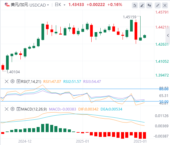 美元在美国国债收益率温和回升的背景下获得了一些正面牵引力,脱离了周二重测的两周低点。另一方面,加元因预期加拿大央行(BoC)将在2025年继续降息而承压,加上加拿大12月年通胀率降至1.8%。除此之外,近期原油价格的下跌削弱了与大宗商品挂钩的加元,并为美元/加元提供了一些支撑。
