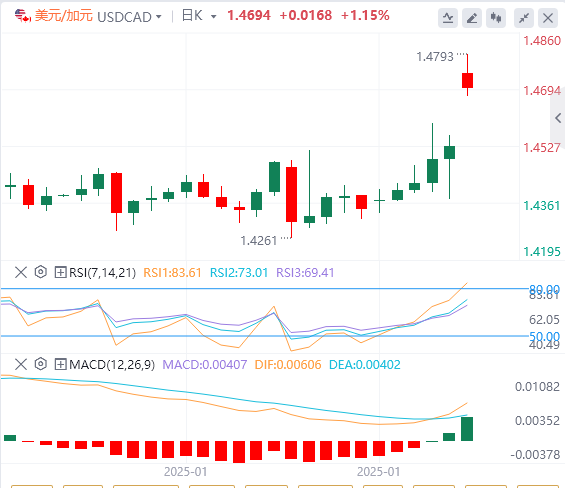 事实上,特朗普在周六下令对加拿大和墨西哥的进口商品征收25%的关税,对中国的商品征收10%的关税,并表示这些关税将从周二开始实施,直到这些国家遏制非法毒品和移民流入美国为止。作为回应,加拿大总理贾斯廷·特鲁多宣布对价值1550亿加元的美国商品征收25%的报复性关税。这反过来又引发了对全球贸易战的担忧,并抑制了投资者对风险资产的胃口。从股市的普遍下跌可以看出这种反风险流动,这有利于避险美元,并为美元/加元货币对提供了强劲的提振。