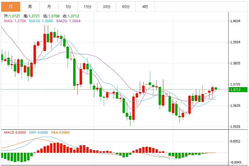 从日线K线图来看,汇价自低点1.3539反弹以来,逐步构筑横盘整理格局,当前在1.3600-1.3750区间内波动。布林带收口明显,布林带上下轨分别位于1.3762和1.3560,表明波动率大幅下降,市场正处于典型的布林带挤压阶段,往往预示后续将面临方向性突破。