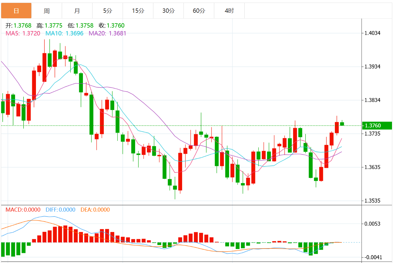 整体来看,汇价近期逐步走高,目前已站上1.3750。上方阻力集中在1.3780-1.3850区间,若突破该区域,技术性上行空间将被进一步打开。下方支撑位在1.3730,若跌破,则恐重回布林中轨1.3672附近。