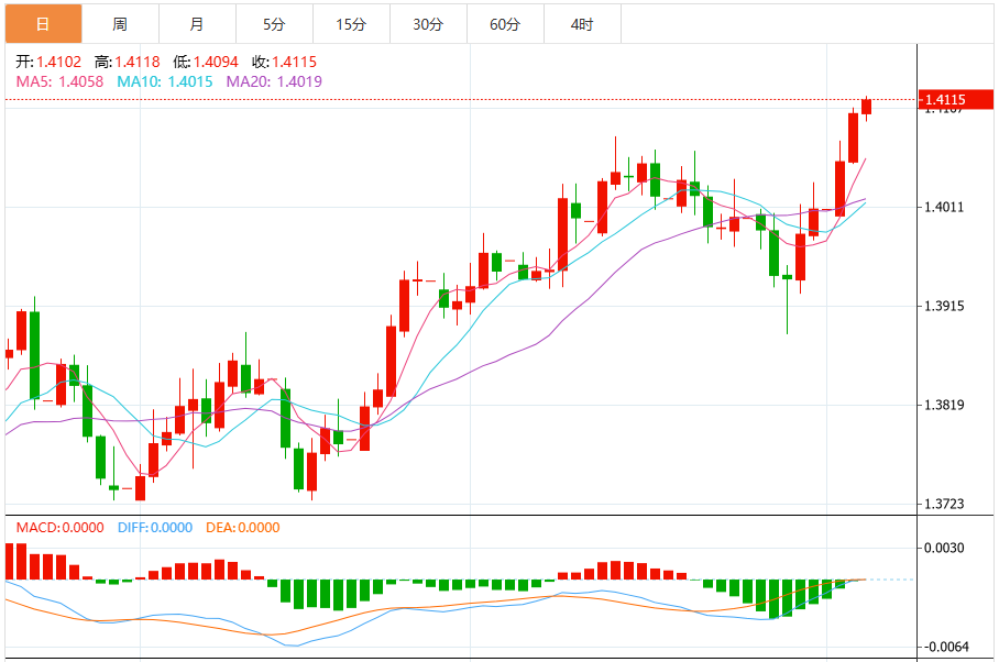 技术层面上,美元兑加元在1.4100上方维持强势结构,短期均线呈多头排列,14日相对强弱指数(RSI)位于50上方,显示多头动能仍在。若汇价突破1.4100阻力位,有望进一步上探1.4150及1.4200关口;