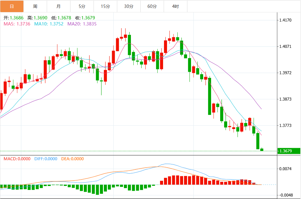 从日线结构来看,美元兑加元(USD/CAD)已进入明显的下行通道。汇价连续多日收阴,并有效跌破前期重要支撑位1.3750,下探至1.3675一线,刷新阶段新低,显示空头力量占据主导。