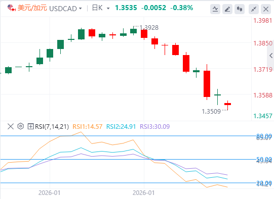 在未能在200日指数移动平均线(EMA)上方建立强势的背景下,本周跌破1.3670-1.3660水平的横向支撑被视为美元/加元空头的关键触发点。 移动平均收敛/发散(MACD)线位于信号线下方,并低于零线,而直方图呈负扩展,表明看跌压力正在加大。 相对强弱指数(RSI)在24(超卖)时显示出下行条件的延伸,但没有明确的稳定迹象。