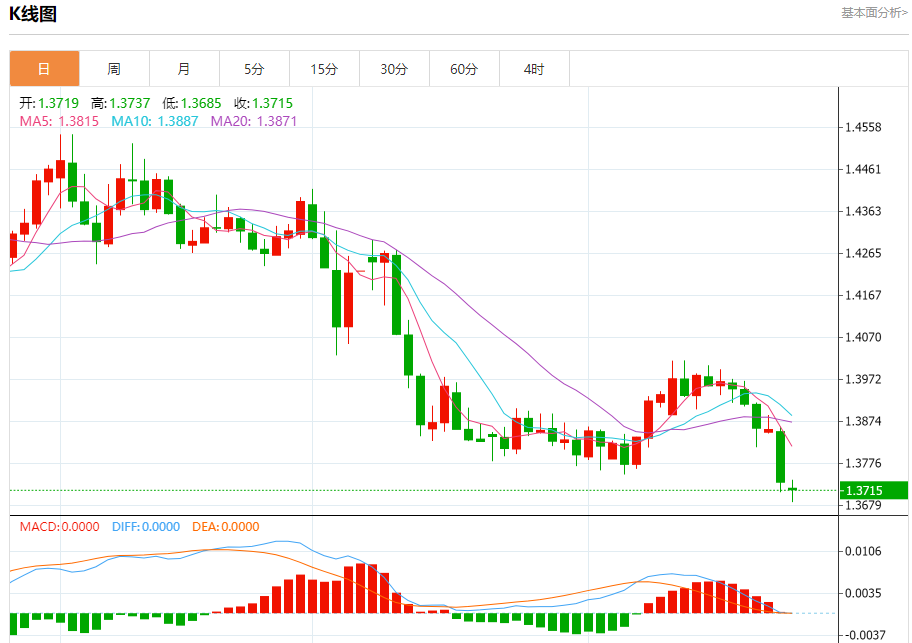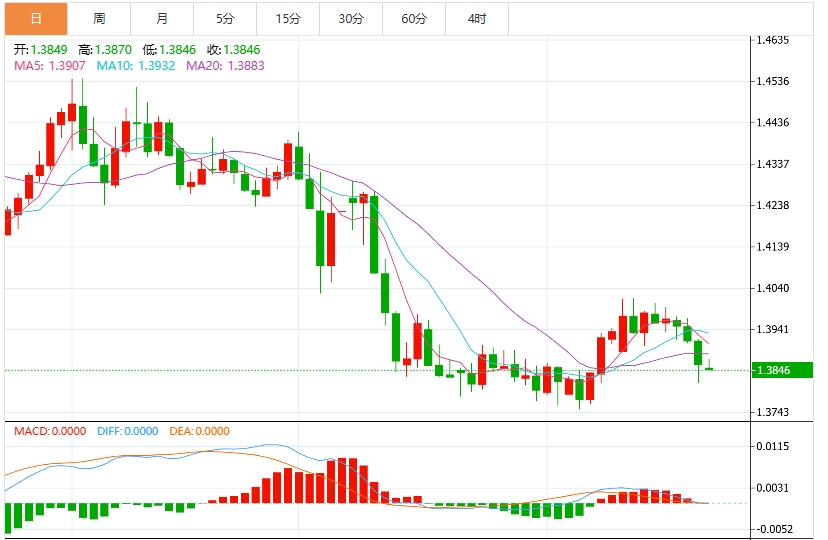 周四(5月22日)欧盘时段,美元兑加元汇率呈现窄幅震荡格局,截至发稿前报1.3867,涨幅0.0361%,日内最高价1.3884,最低价1.3845。 货币兑:美元/加元 一、行情分析 技术面显示,该货币对在1.3841-1.3885区间内波动,日线级别受50日指数移动平均线(A50)压制,4小时图相对强弱指数(RI)在50附近徘徊,显