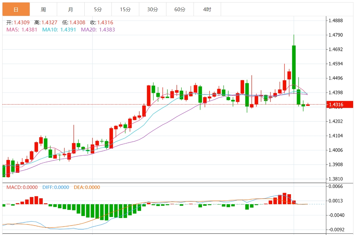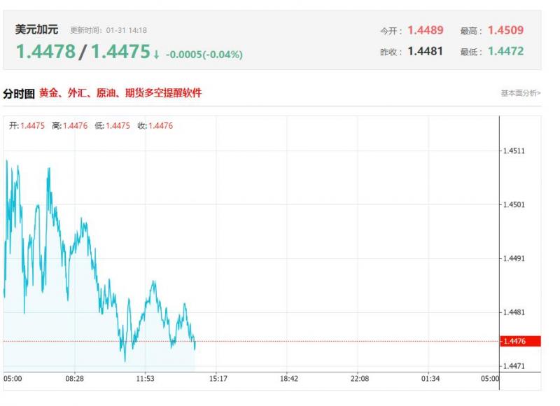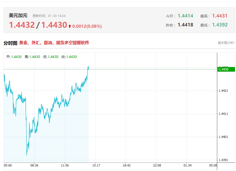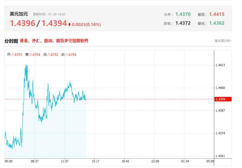美元兑加元今日汇率最高1.4394,最低1.4392,涨跌0.0023,涨跌幅0.16%。 市场基本面分析 加拿大CI通胀符合预期,月率为-0.4%,年率为1.8%,加拿大央行(BoC)对通胀高于或低于2%目标的担忧程度相当,市场预计1月29日BoC利率决策将降息25个基点。特朗普上周表示,他可能从2月1日起对来自加拿大的产品征收关