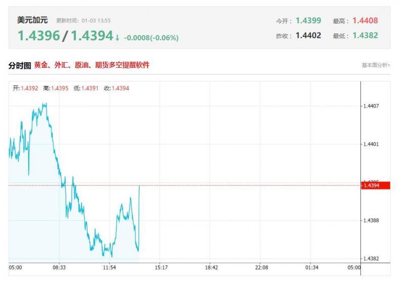 1月3日,周五欧洲早盘时段,美元/加元结束了连续三天的上涨,交投于1.4390附近。由于加拿大是美国最大的石油出口国,原油价格的上涨为与商品挂钩的加元(CAD)提供了支撑。 西德克萨斯中质原油(WTI)价格连续第六天上涨,截至发稿时交投于每桶73.00美元附近。WTI价格周四达到两个月半高点73.39美元。原油价格受到全球