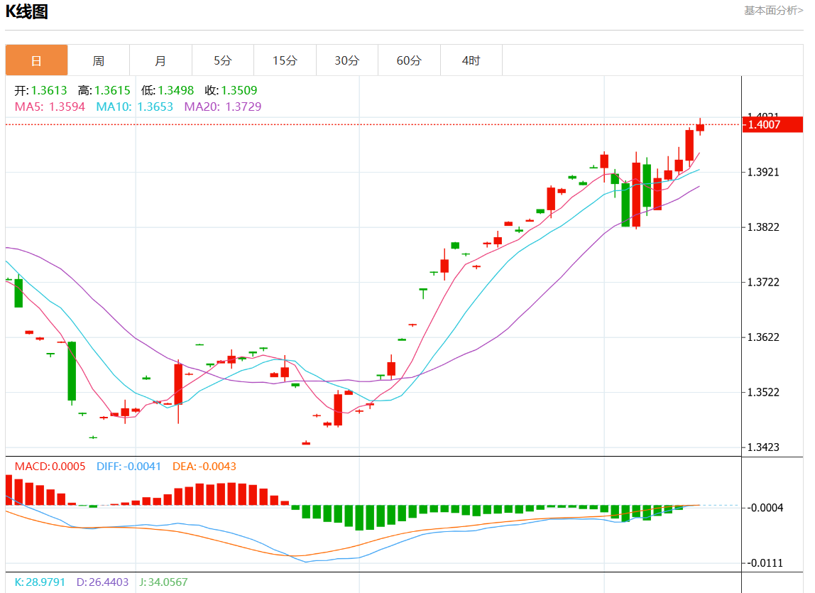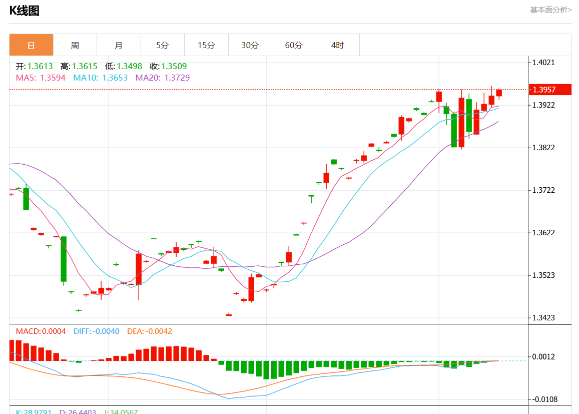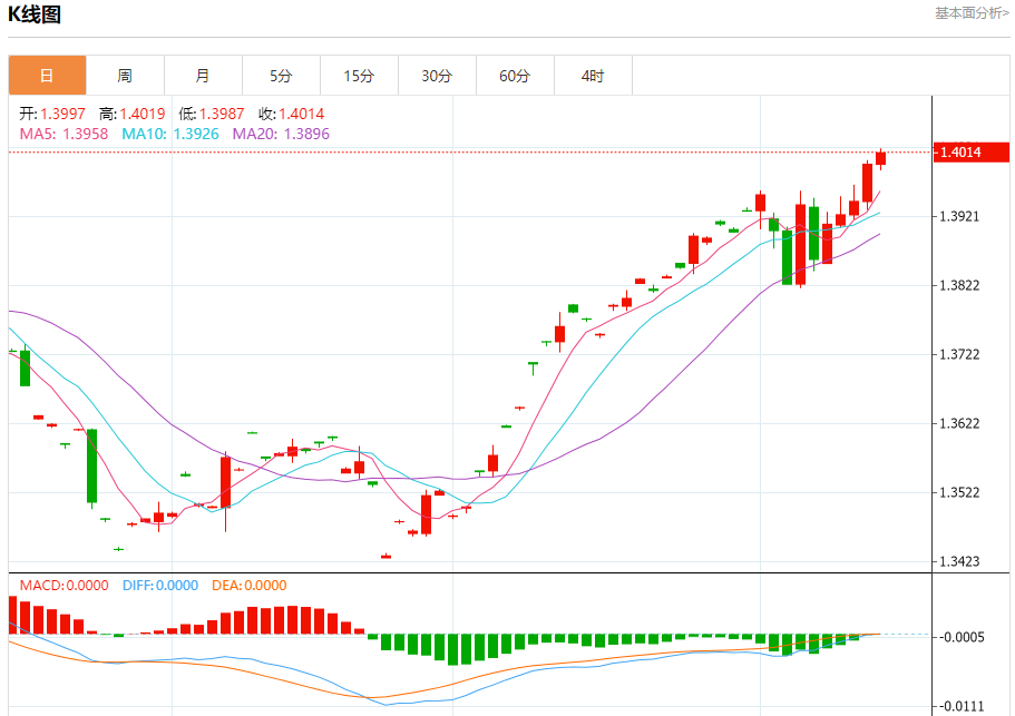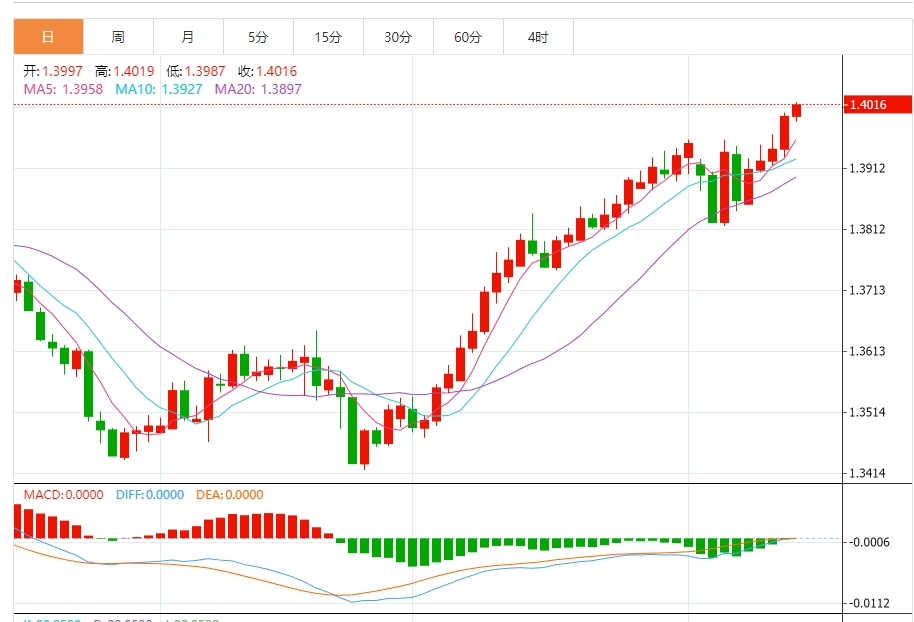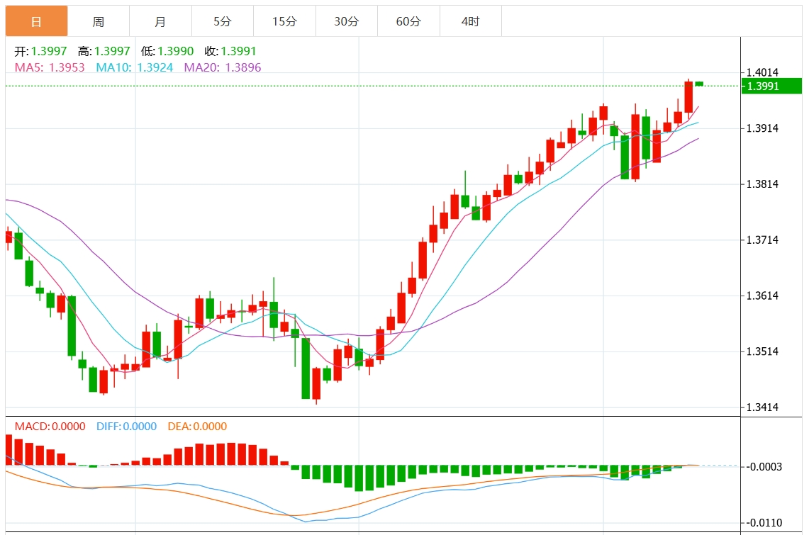 美元兑加元今日汇率最高1.4019,最低1.3987,涨跌0.0019,涨跌幅0.14%。 市场基本面分析 外汇分析师AkhtarFaruqui称,14天相对强弱指数(RI)是一种广泛用于发现超买或超卖状况的指标,目前略低于70水平。这表明美元兑加元的看涨势头仍在持续,但尚未发出超买状态的信号。如果14天RI超过70,交易者可能