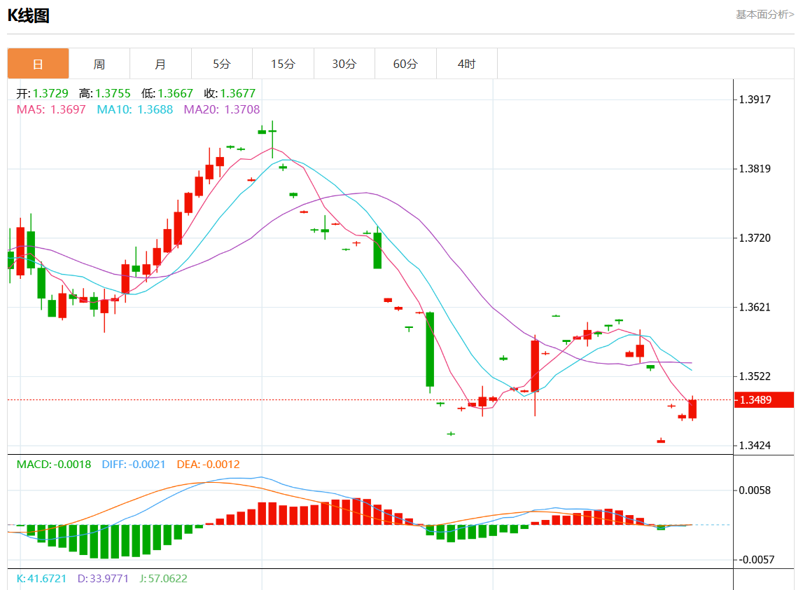 周二盘中,美元/加元报1.3517,跌幅0.17% 今日分析:在1.3550之下,看跌,目标价位为1.3485,然后为1.3460。 技术点评:RI技术指标向下运行。 支撑位:1.36001.35801.3550 阻力位:1.34851.34601.3440 (亚汇网编辑:静香)
