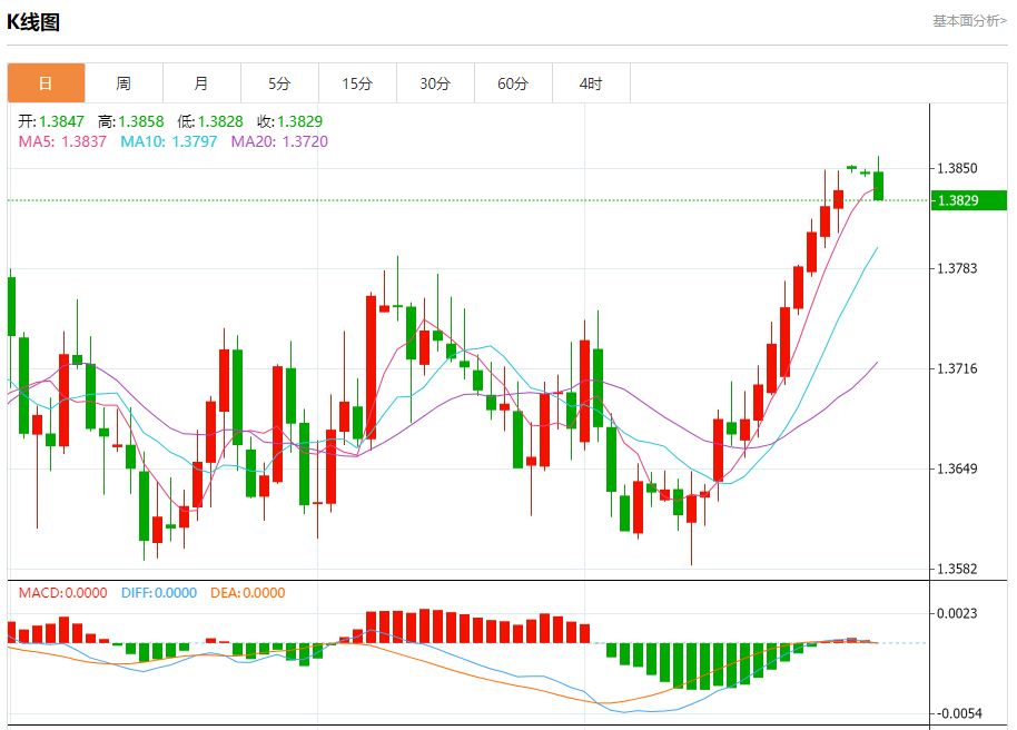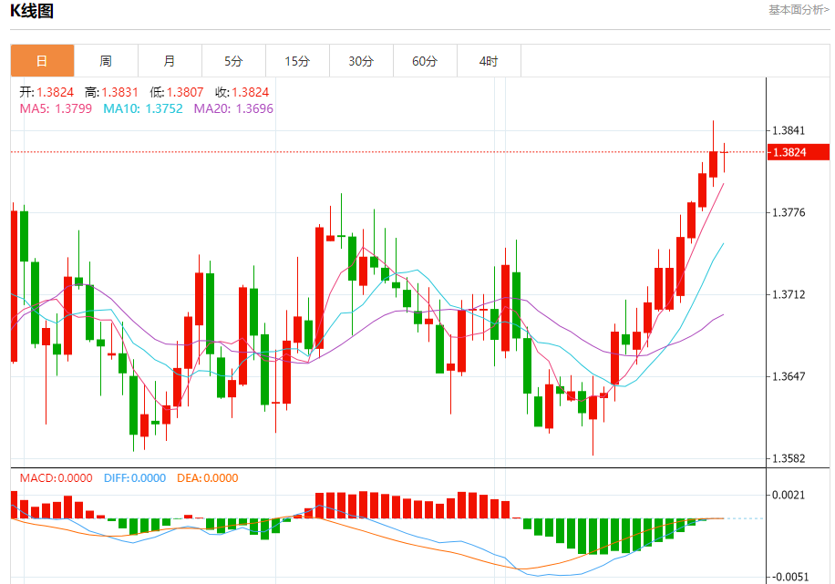 周一盘中,美元/加元报1.3835,涨幅0.02%. 今日分析:在1.3810之上,看涨,目标价位为1.3845,然后为1.3860。 技术点评:1.3810附近形成了一个支撑的底部,将带来走势短期内的稳定。 支撑位:1.38801.38601.3845 阻力位:1.38101.37951.3780 (亚汇网编辑:静香)