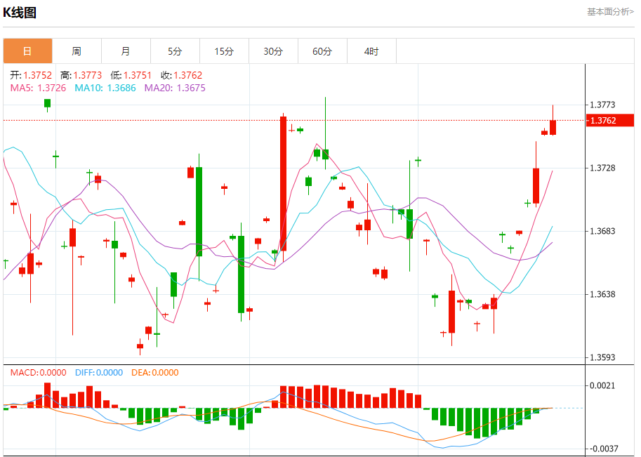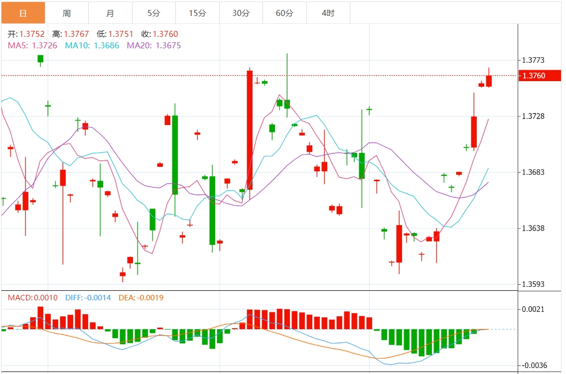 周二盘中,美元/加元报1.3769,涨幅0.09%. 今日分析:在1.3740之上,看涨,目标价位为1.3775,然后为1.3790。 技术点评:1.3740附近形成了一个支撑的底部,将带来走势短期内的稳定。 支撑位:1.38101.37901.3775 阻力位:1.37401.37251.3705 (亚汇网编辑:静香)