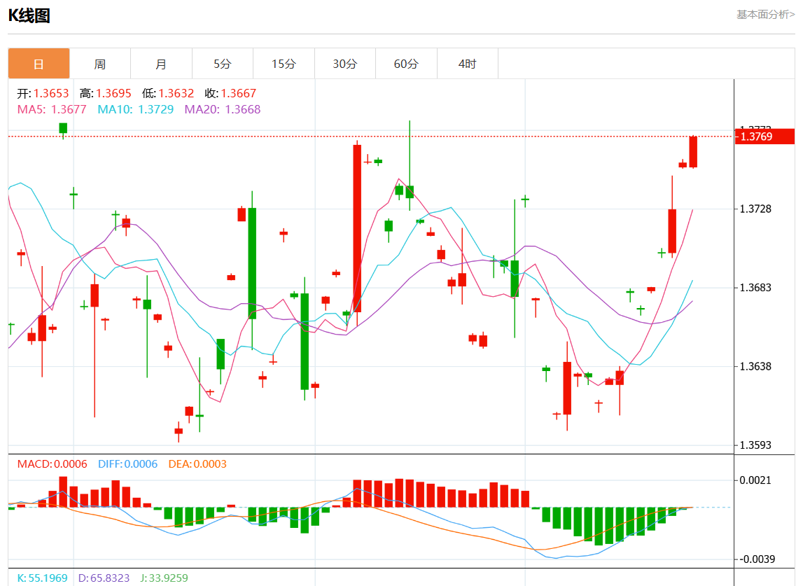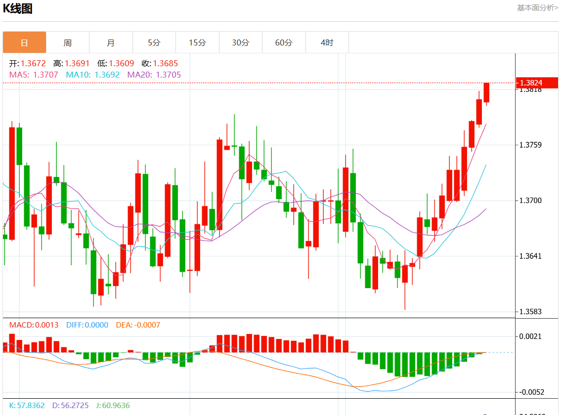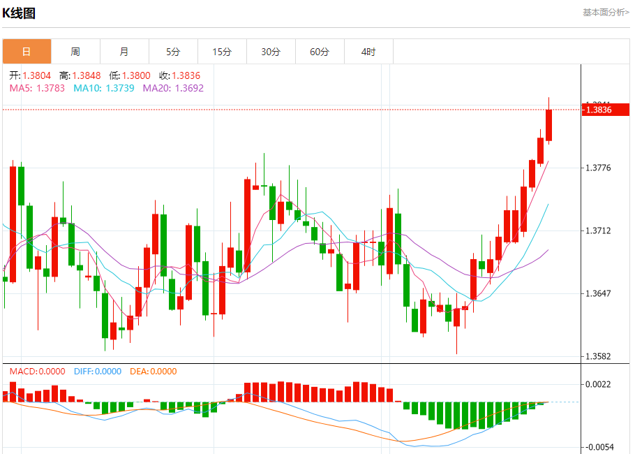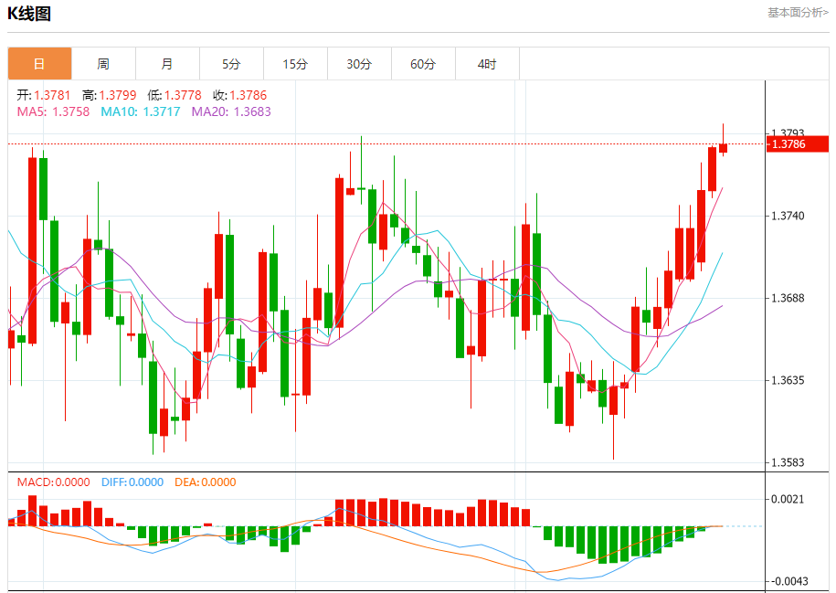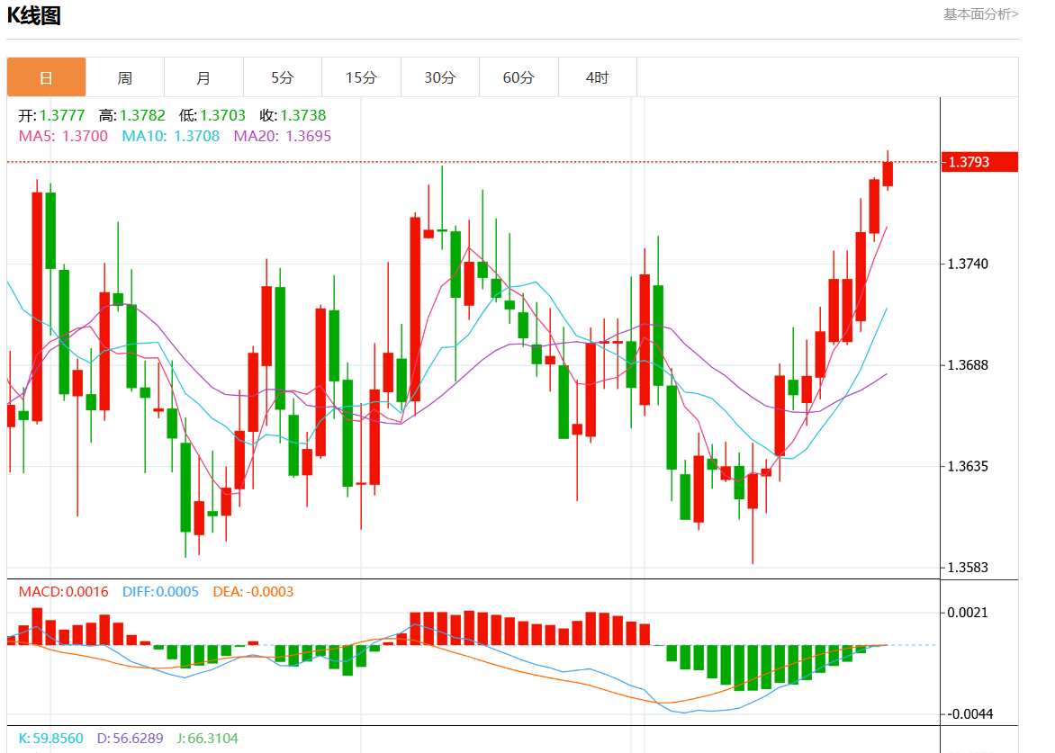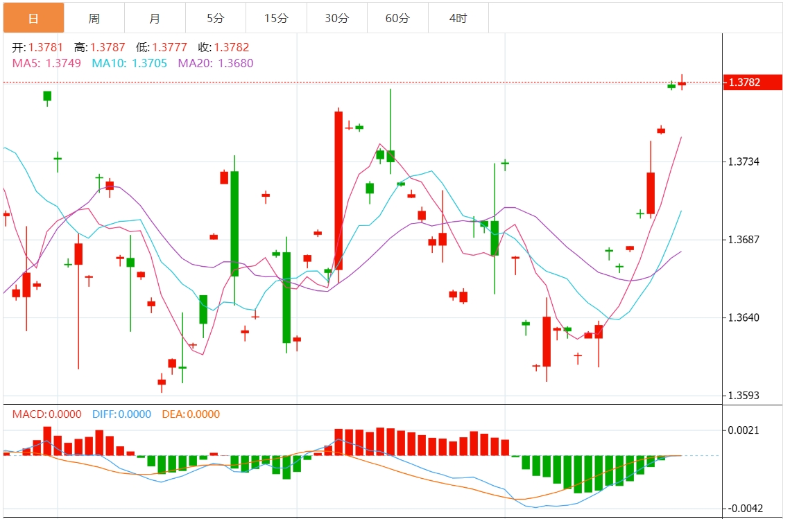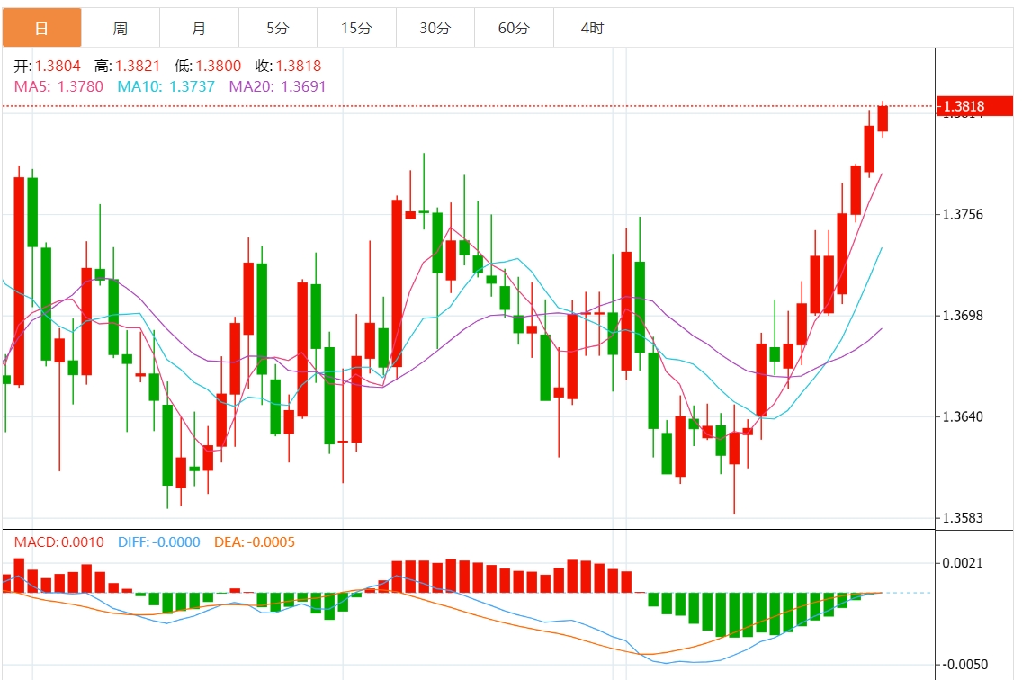 周四盘中,美元/加元报1.3823,涨幅0.12%. 今日分析:在1.3795之上,看涨,目标价位为1.3845,然后为1.3870。 技术点评:在1.3795之上,为多头信号,向上的目标位为1.3845。 支撑位:1.38951.38701.3845 阻力位:1.37951.37751.3755 (亚汇网编辑:静香)